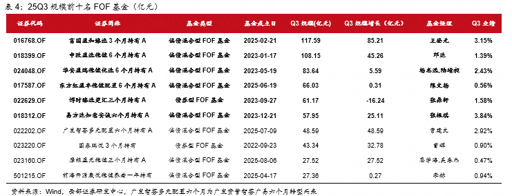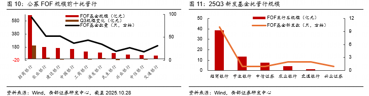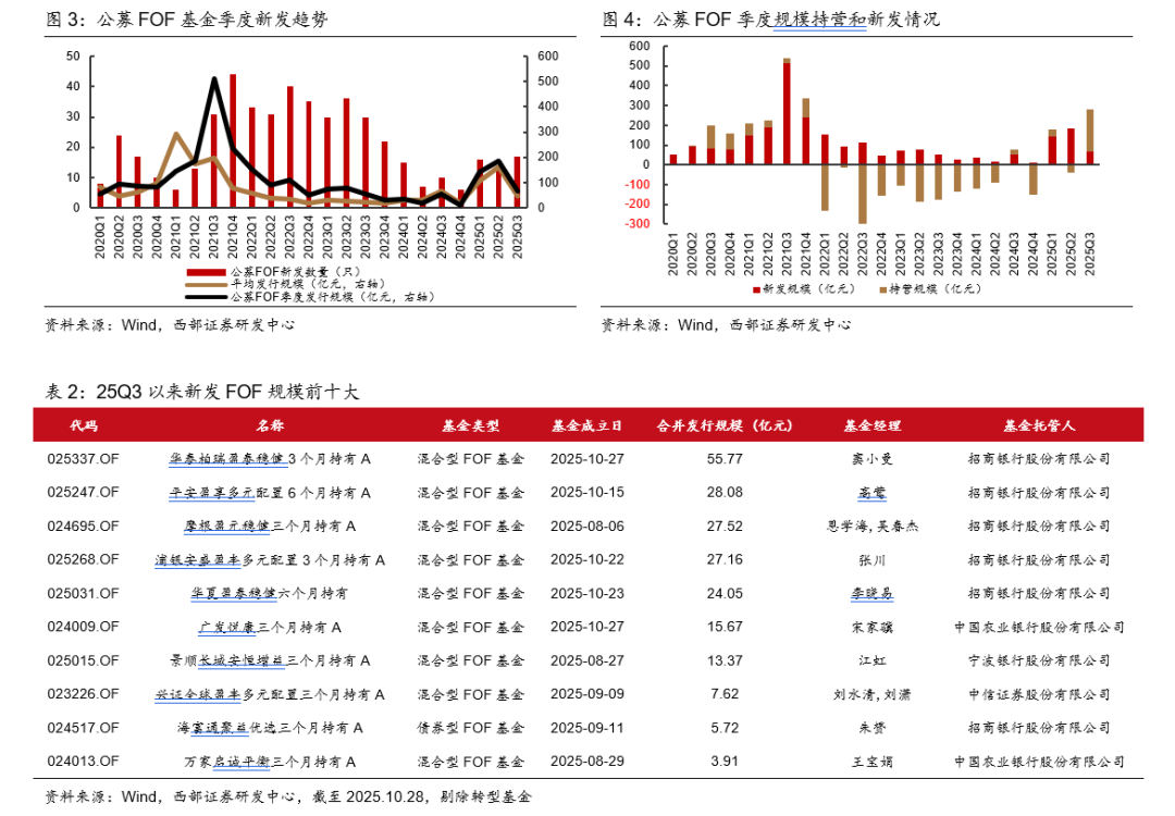 Q3新发数量增长,规模下降。25Q3,FOF基金新发17只、规模合计65.32亿元,平均单只基金发行规模3.84亿元。相对25Q2,新发数量增长、规模下降。3季度以来(截止2025.10.28),FOF新发数量25只、规模合计218.05亿元,平均单只基金发行规模8.72亿元。25年10月以来,新发回暖趋势显著。25Q3以来,新发规模10亿元以上基金7只,其中,华泰柏瑞盈泰稳健3个月,以募集规模55.77亿元居首,该基金为混合型FOF,基金经理窦小曼,托管行为招商银行。另外,平安盈享多元配置6个月、摩根盈元稳健三个月、浦银安盛盈丰多元配置3个月、华夏盈泰稳健六个月的托管行均为招商银行,广发悦康三个月、景顺长城安恒增益三个月的托管行分别为农业银行、宁波银行。