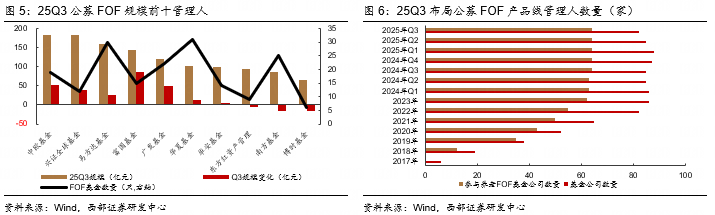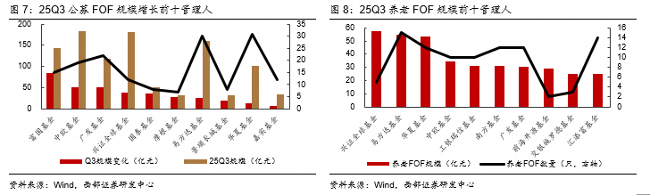 从规模变化看,25Q3有52家基金公司FOF规模上升。9家基金公司Q3规模增长超10亿元,富国、中欧、广发规模增长超50亿元,兴证全球、国泰、摩根、易方达规模增长超20亿元,景顺长城、华夏规模增长超10亿元。