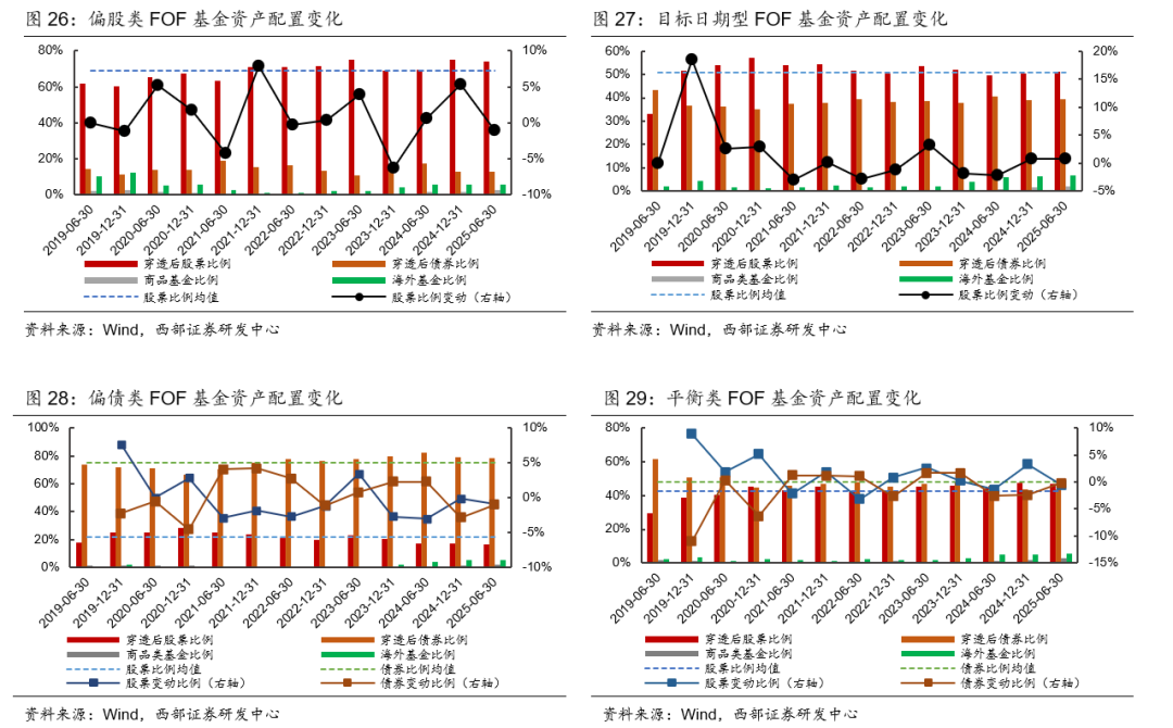 仅目标日期FOF仓位提高。25H1穿透持仓后,偏股类FOF、目标日期类FOF、偏债类FOF、平衡类FOF股票仓位分别为73.94%、51.19%、16.56%、46.91%,相对24H2变动分别为:-1.03pct、+0.72pct、-0.92pct、-0.57pct。19H1-25H1共13个报告期,偏股类FOF、目标日期类FOF、偏债类FOF、平衡类FOF股票仓位均值分别为68.87%、51.00%、21.69%、42.83%,可见在25H1偏债类FOF股票仓位在区间均值之下,其余3类FOF基金股票仓位均在区间均值之上。