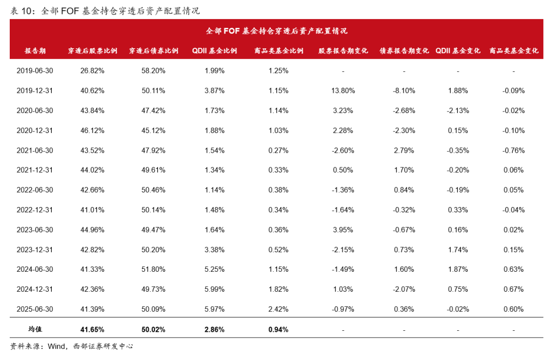 通过FOF基金定期半年报/年报全部持仓穿透计算其在股票、债券、商品和海外资产上的配置。下文中提到的“占比”均为占基金净资产比例,穿透后股票比例为:FOF基金直投股票比例与其持仓基金按照占基金净资产比加权后股票比例之和;穿透后债券比例为:FOF基金直投债券比例与其持仓基金按照占基金净资产比加权后债券比例之和;由于商品类资产、海外资产投资比例较小且主要通过投资基金来实现,以持仓基金中QDII基金占比作为海外资产比例、以各类投资商品的基金(包括各类黄金、白银、原油、有色金属等)占比作为商品配置比例。