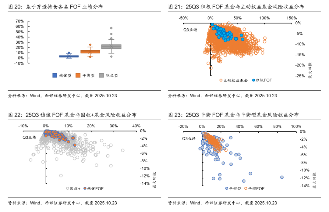 与万得基金指数对比来看,(1)25Q3,偏股混合、平衡混合、偏债混合型FOF基金指数相对其同等风险的基金指数,超额收益率分别为-4.05%、-2.38%、-0.44%,在最大回撤和波动率上均占优。(2)25年以来,偏股混合、平衡混合、偏债混合FOF基金指数相对其同等风险基金指数,超额收益率分别为-6.30%、0.52%、-0.01%,在最大回撤和波动率上均占优。