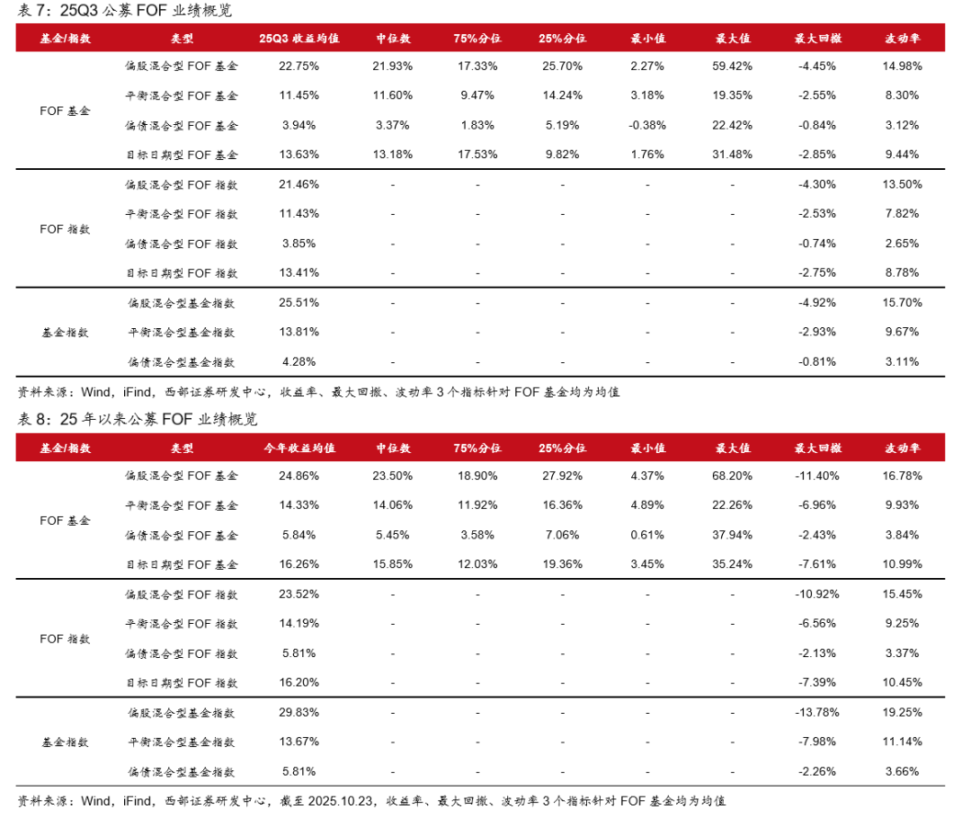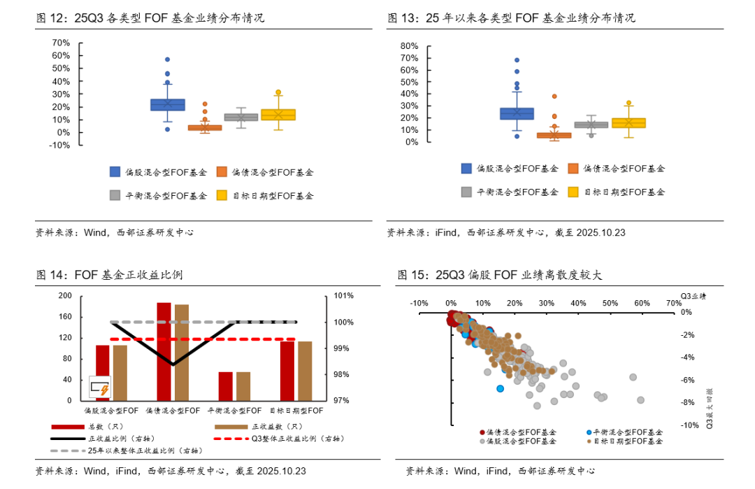 FOF正收益比例为99.35%。25Q3,偏股FOF、平衡FOF、目标日期型FOF正收益比例均达100.00%,偏债FOF正收益比例为98.40%。25年以来,全部FOF正收益比例达100.00%。
