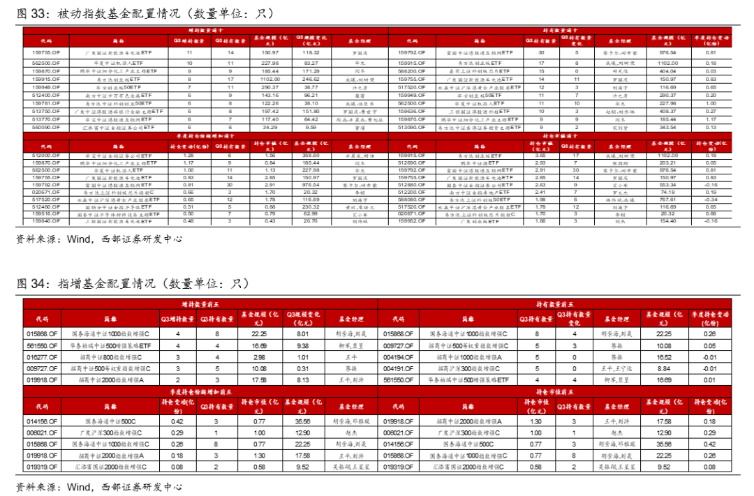 25Q3,被增持较多的主动权益基金为易方达成长动力、博道成长智航、财通资管数字经济等;被动型基金中持仓规模前三为易方达创业板ETF、鹏华中证酒ETF、富国中证港股通互联网ETF;指增基金被持有数居前的为国泰海通中证1000指增、招商中证500等权重指增、招商中证1000指增等;固收+基金被增持较多的为华泰保兴尊合、景顺长城景颐丰利、永赢稳健增强等;纯债基金被增持数前三为鹏扬中债-30年期国债ETF、博时上证30年期国债ETF、海富通中证短融ETF;商品型基金增持数量居前为华安黄金ETF、博时黄金ETF、广发上海金ETF、大成有色金属期货ETF。