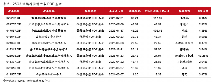 25Q3规模增长基金共297只,占比57.34%。如剔除新发基金,3季度规模实现增长的FOF基金共计278只,占比55.82%。规模增长较显著的是,富国盈和臻选3个月持有、广发智荟多元配置六个月持有、中欧盈选稳健6个月持有,分别增长85.21亿元、48.59亿元、45.26亿元。25Q3有11只基金规模增长超10亿元,有17只基金规模增长超5亿元。