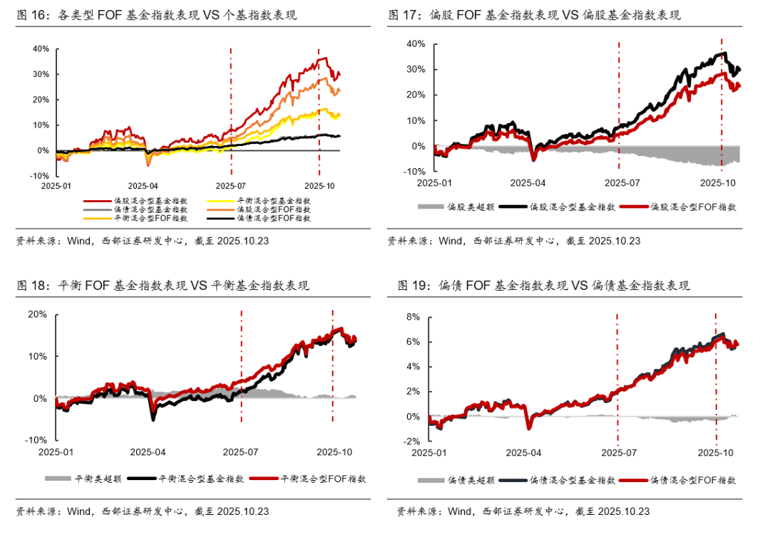 从各类FOF指数和对应风险的基金指数走势图中可见,偏股类FOF相对偏股混合型基金指数的超额,在25Q3及25年以来均为负,且3季度负超额幅度进一步扩大,在市场快速上行阶段,FOF因持仓分散等业绩相对落后。平衡FOF相对平衡混合型基金指数的超额,在25Q3及25年以来均为正,主要或因平衡FOF大多仓位上限较高。偏债FOF与偏债混合型基金指数,走势较接近。