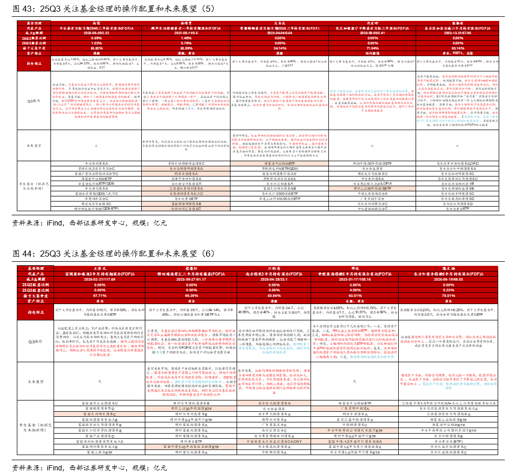 我们从三个角度筛选关注基金经理,第一个角度是25Q3业绩优异,选择各类型排名前10的FOF基金现任基金经理,第二个角度是在管规模前10名基金经理,第三个角度是基金管理人FOF规模前10名的代表性基金经理。综合考虑这些筛选角度并去除重复项之后,我们筛选出30名基金经理,来看其3季度的配置情况、核心操作及未来展望。留存率为25Q2前十大持仓基金在25Q3中仍留存的比例。集中度为前十大持仓基金规模占基金净资产比例。新增基金为25Q2中未持有,25Q3新增持。