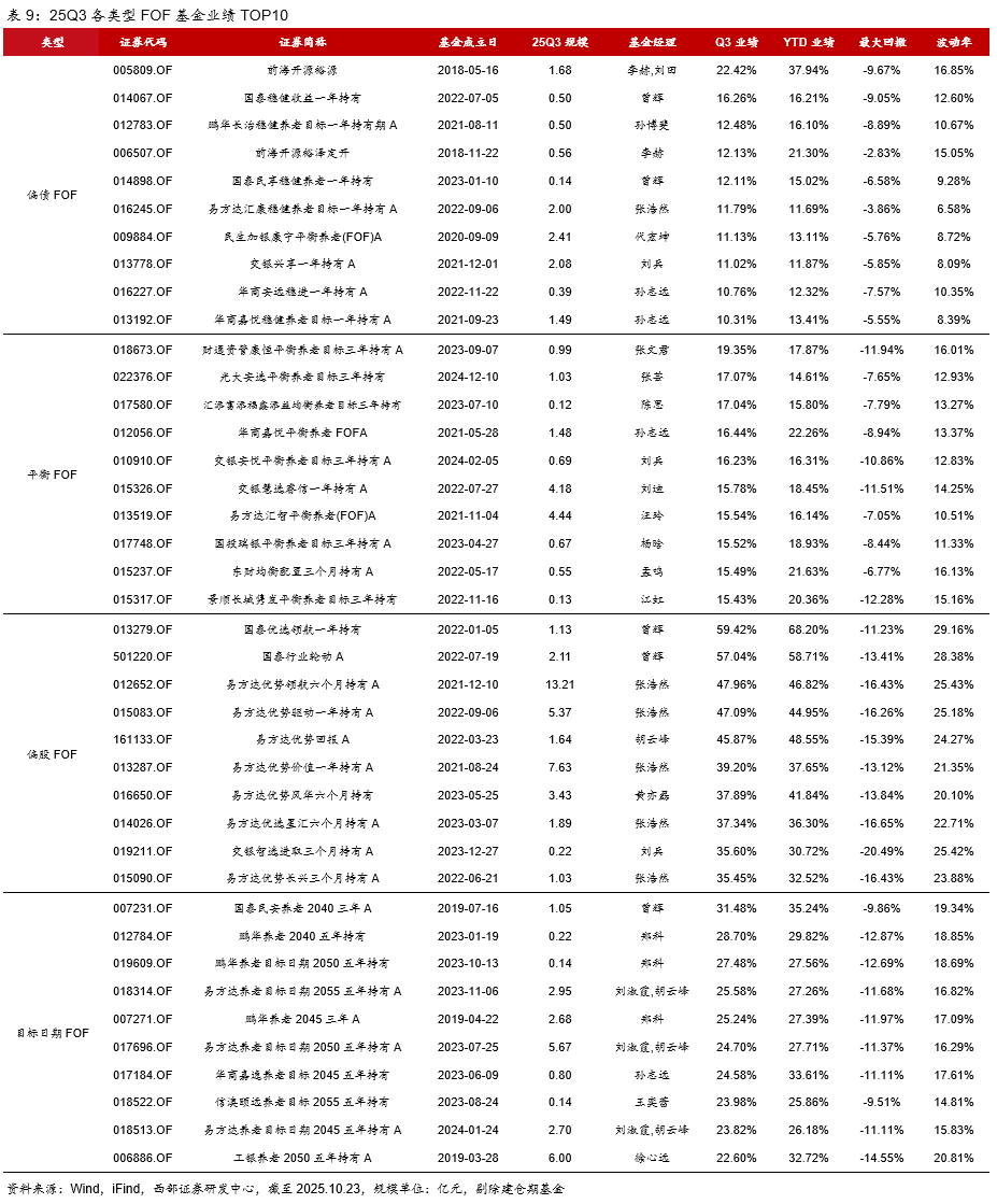 3季度,四类FOF基金收益率均为正。偏股混合型FOF、平衡混合型FOF、偏债混合型FOF、目标日期型FOF,25Q3收益率均值分别为22.75%、11.45%、3.94%、13.63%;25年以来(截至2025.10.23,下同)收益率分别为24.86%、14.33%、5.84%、16.26%。