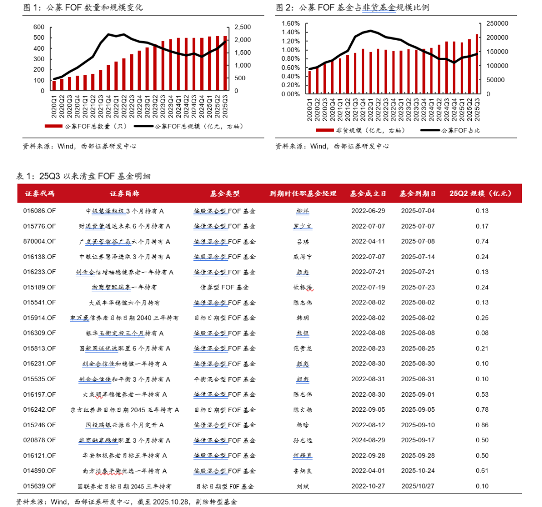 25Q3,公募FOF规模保持上升趋势,增加278.16亿元。根据Wind数据,25Q3公募FOF基金数量518只、规模1934.89亿元,较25Q2数量增1只,规模增278.16亿元。25年3季度以来(截止2025.10.28),有19只FOF基金清盘,其中6只为养老基金,4只有Y份额。