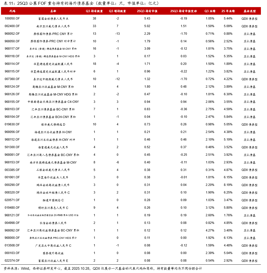 公募FOF基金可投资的海外债券基金包括QDII债基、香港互认债券型基金。(1)25Q3被FOF基金持仓数量最多的前三名为富国全球债券(38只基金持有)、南方亚洲美元债(33只基金持有)、华夏精选固定收益配置(份额合并计算24只基金持有);(2)富国全球债券、南方亚洲美元债、摩根国际债券是持仓市值前三。(3)南方亚洲美元债被增持数量最多,其次为银华美元债精选、工银全球美元债、博时亚洲票息等。(4)持仓的高收益债基增多,如鹏华全球高收益债、广发亚太中高收益、国泰境外高收益、汇丰亚洲高收益债券、弘收高收益波幅管理债券。