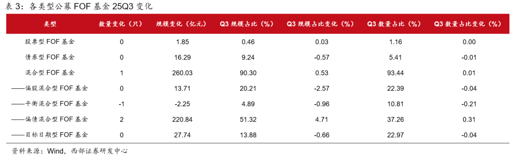 偏债类产品数量和规模双升。3季度,债券型FOF数量不变,规模增16.29亿元;股票型FOF数量保持不变,规模增1.85亿元;混合型FOF数量增1只,规模增260.03亿元,其中偏债混合型、偏股混合型、目标日期型规模分别增220.84亿元、13.71亿元、27.74亿元,平衡混合型规模减少2.25亿元。