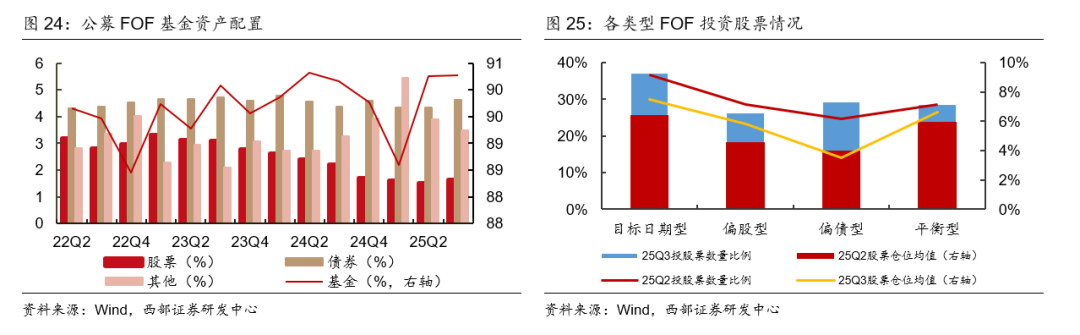 FOF基金要求不低于80%基金资产投资于公募基金,其余部分可少量投资股票、债券等资产。从持仓结果来看,FOF基金仍主要投资基金,基金占比维持在88%-91%之间,处于超配状态;债券资产比例维持在4.5%左右,满足流动性需求;股票投资比例维持在5%以内。25Q3基金资产比例为90.27%,较25Q2提高0.01pct;25Q3股票资产比例为1.63%,较25Q2上升0.11pct。