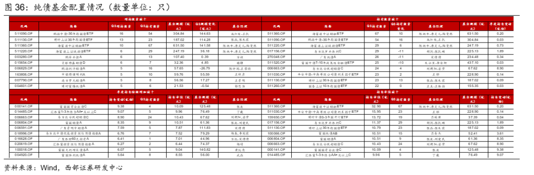 纯债基金中,(1)25Q3被FOF基金持仓数量最多的前三名为海富通中证短融ETF(67只基金持有)、鹏扬中债-30年期国债ETF(54只基金持有)、海富通上证城投债ETF/易方达岁丰添利(29只基金持有);(2)25Q3被FOF基金增持数量前三名基金为鹏扬中债-30年期国债ETF(16只基金增持)、博时上证30年期国债ETF(13只基金增持)、海富通中证短融ETF(10只基金增持);(3)25Q3被FOF基金增持份额数最多的前三名基金为富国国有企业债(被增持9.38亿份)、汇添富1-3年隐含AA+及以上(被增持9.07亿份)、易方达安悦超短债(被增持8.90亿份);(4)Q3被FOF基金持仓规模前三大为海富通中证短融ETF、平安中债-中高等级公司债利差因子ETF、博时中债0-3年国开行ETF。