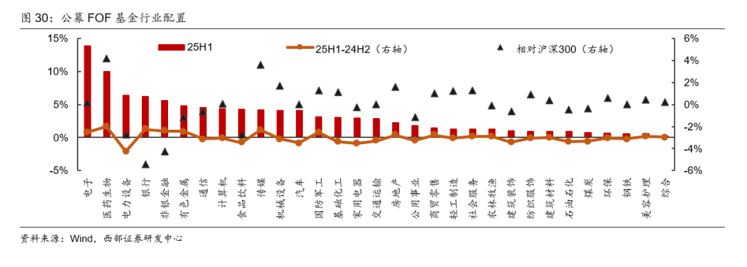 进一步穿透FOF基金持仓,来看其在行业上的配置变化。25H1公募FOF行业配置比例排名前五的分别是:电子、医药生物、电力设备、银行、非银金融,占比分别为13.85%、10.02%、6.36%、6.17%、5.55%,较24H2变动分别为+0.83pct、+1.67pct、-2.14pct、+1.25pct、+0.99pct。25H1相对24H2增配行业前五大为医药生物(+1.67pct)、银行(+1.25pct)、传媒(+1.12pct)、非银金融(+0.99pct)、有色金属(+0.97pct)。25H1公募FOF相对沪深300超配医药生物、传媒、机械设备、房地产、国防军工,低配银行、非银金融、电力设备、食品饮料、有色金属。