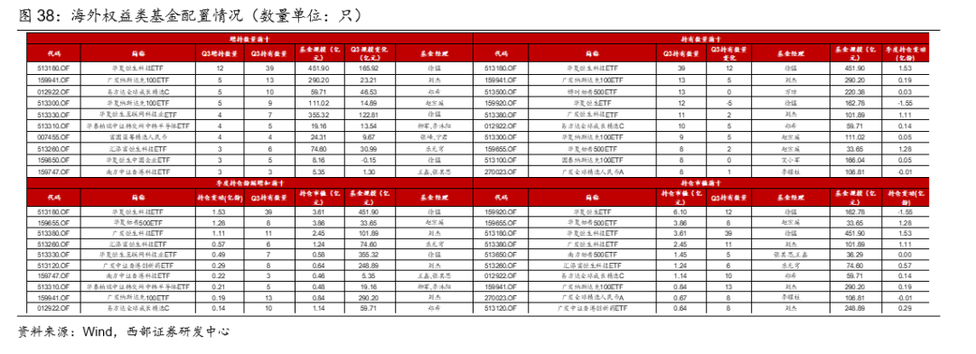 Q3重仓基金中,偏股基金、二级债基、商品型基金占比提高:(1)权益类基金中偏股型基金占比提高。(2)固收+基金中,二级债基规模和数量占比均提高。(3)债券型基金中,被动指数型债基规模占比大幅提高。(4)QDII基金数量占比继续攀升。海外债基中,QDII债基和香港互认债基规模占比均下滑。(5)商品型基金被显著增持。