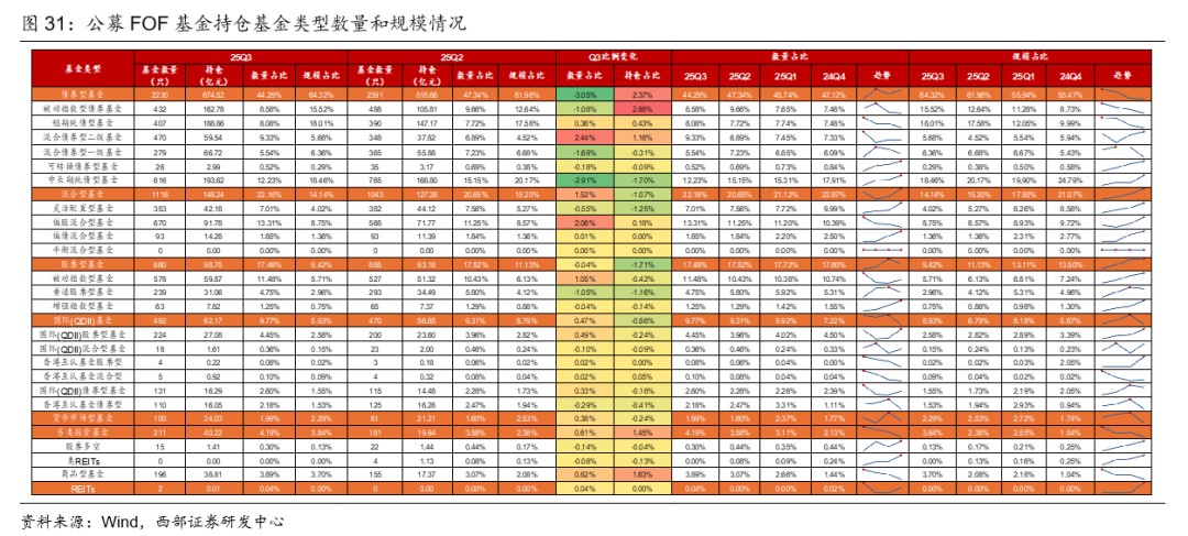 25Q3,权益类基金中偏股型基金占比提高;固收+基金中,二级债基占比提高;债券型基金中,被动指数型债基规模占比大幅提高;QDII和商品被显著增持。